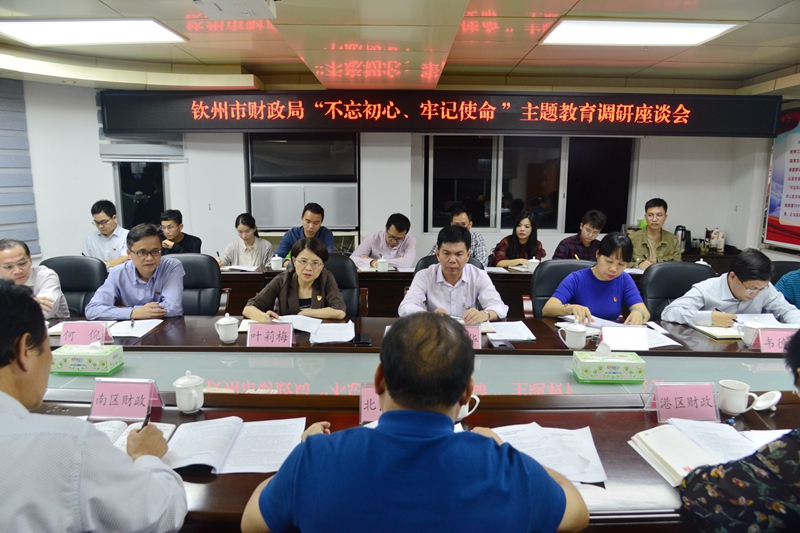 调研组一行首先实地查看了钦北区财政局党建阵地建设情况,随后在钦北区财政局三会楼会议室召开钦州市财政局“不忘初心、牢记使命”主题教育调研座谈会。会议由叶莉梅同志主持,市财政局领导班子成员,相关科室负责人,主题教育工作领导小组办公室成员以及钦南区、钦北区,钦州港区财政局领导班子成员参加会议。